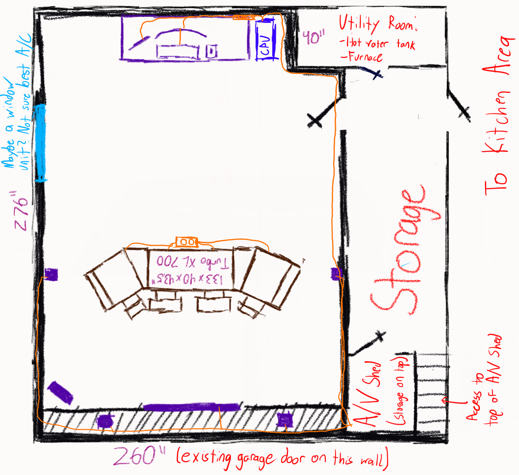 In October 2024, after measuring our garage, I made several sketches of what I might want the final space to look like. I had never done any construction on this scale before, so there were a ton of practical questions I couldn't answer in domains like HVAC, insulation, wiring, and lighting. Still, I sketched this: