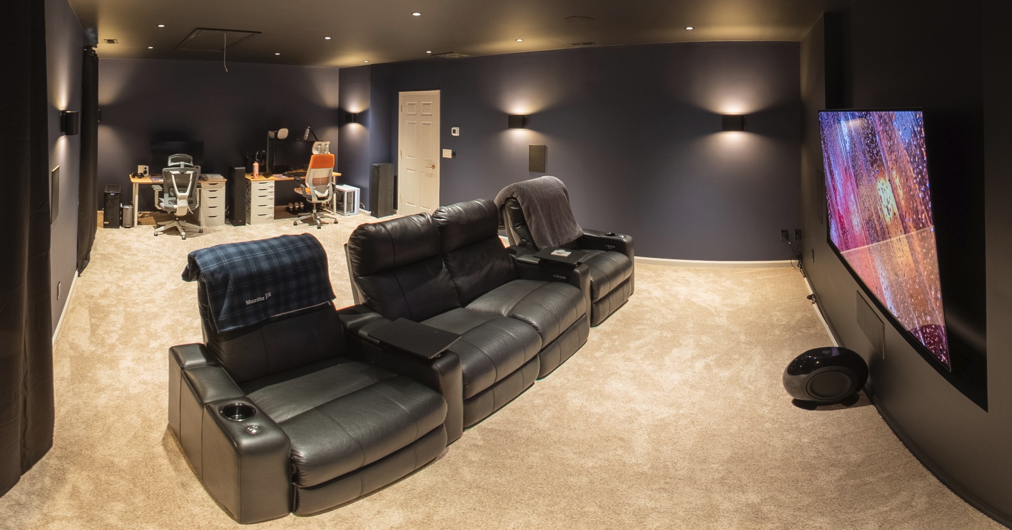 The display wall and ceiling are painted in Sherwin-Williams Tricorn Black with a Matte finish. This color seems to be a widely praised theater paint color, and for good reason. Its low Light Reflectivity Value (LRV) of 3 means it absorbs tons of light, which makes the edges of our OLED TV disappear into the wall.
